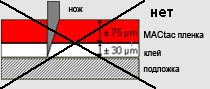 Правильно подбирайте глубину при подрезке. Нож должен прорезать пленку (±75µm) и клеевой слой (±30µm). |